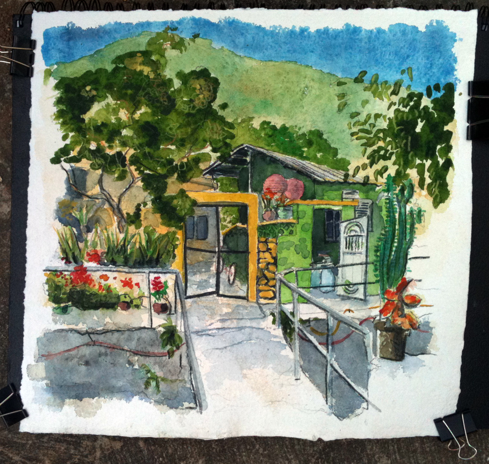 I pulled out my copy of Mui Chong Ki’s drawings of Hong Kong yesterday and studied them for awhile. I am satisfied with my drawing style and am content to let it progress as it sees fit. But my paintings look too illustrative and need something more. I either need to paint faster and looser or spend more time resolving more details. This one seems in between. I’ll see what I can do to it later. I may need to take a couple of days to do a larger work. I think more gestural watercolors are needed until I get loosened up a bit more. We’ll see. Right now I’m hungry and am headed into the city to seek out some wonton noodles.