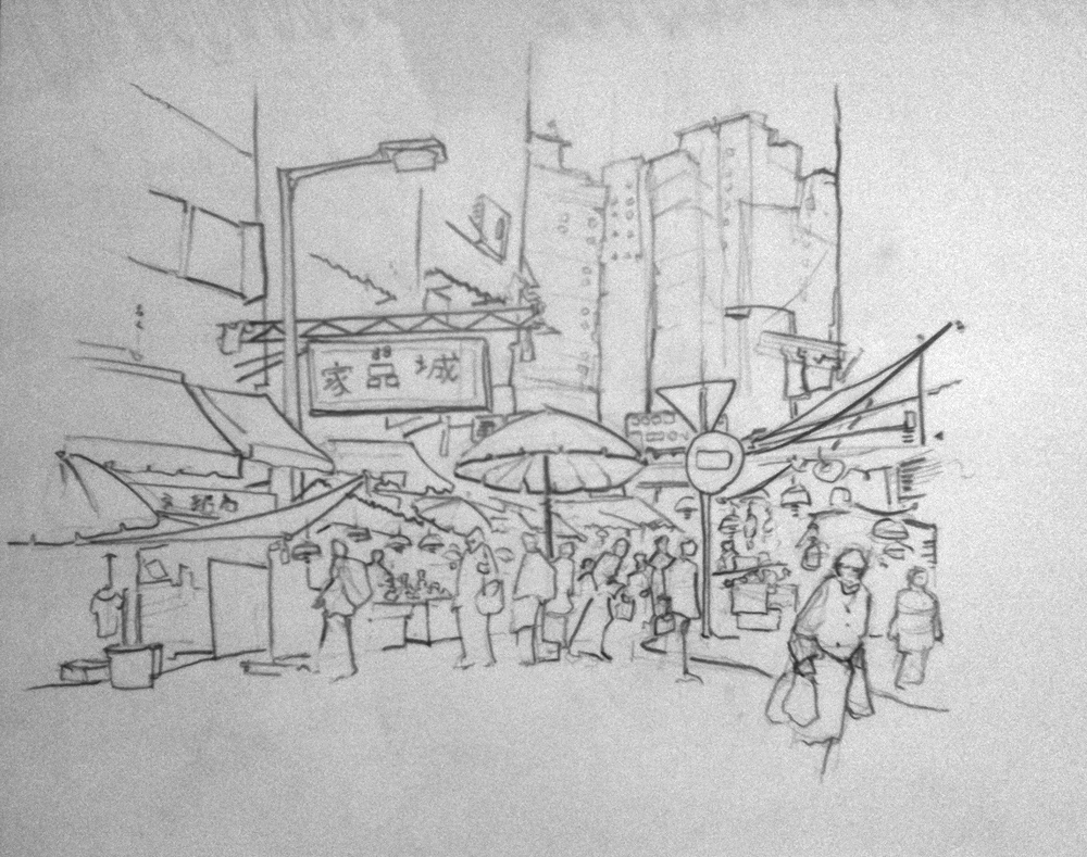 I left for Shau Kei Wan. Had an hour to kill and did this drawing at the wet market near the MTR. Enough people stopped to watch that I had to pause and wait so I could see what I was drawing. There are worse problems an artist can have besides having an audience. So a big shout out to the home boys and girls in SKW. See you again in the morning.