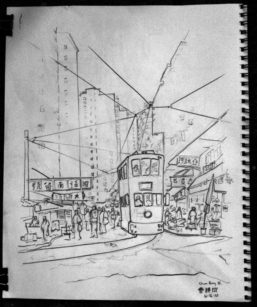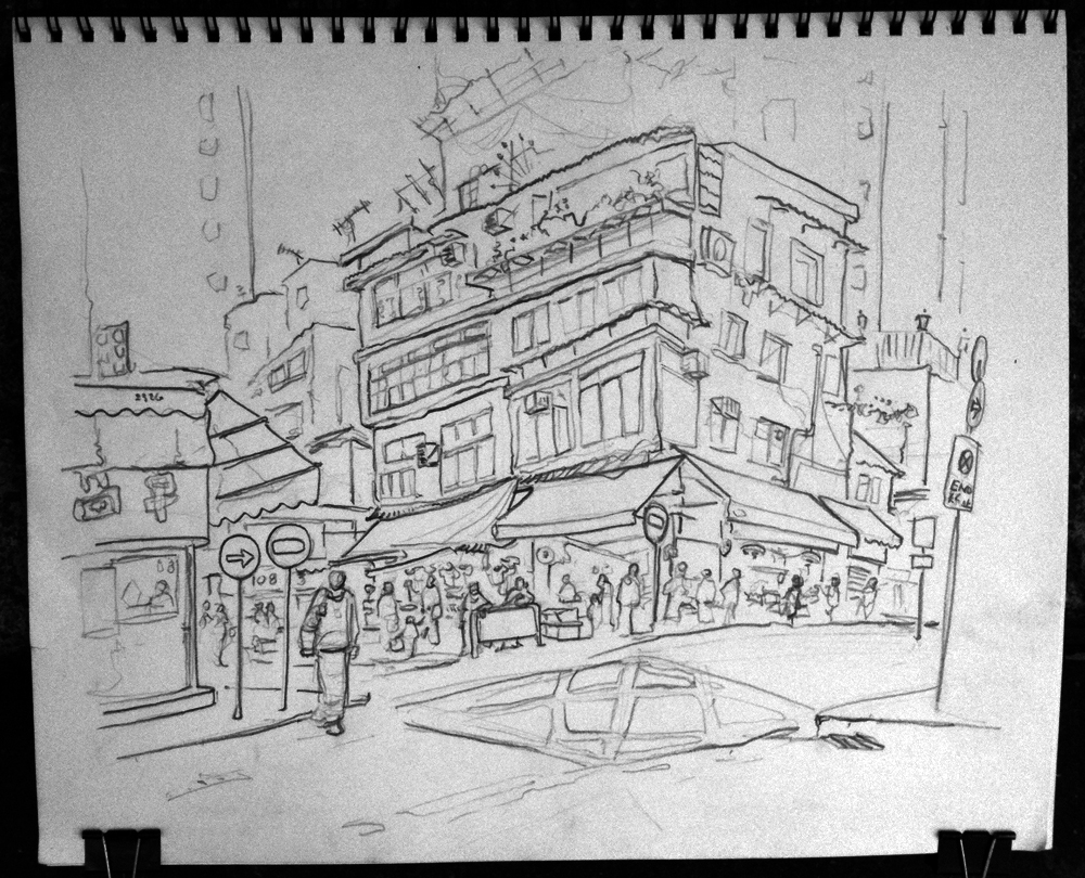 From there I went to North Point via the tram. I stayed a little over 2 hours and drew these pictures at Marble Road, a famous street market known for cheap clothes. This part of town has a lot of immigrants from Fugian Provence, China. They are well known for their meatballs stuffed with whole garlic cloves. Very tasty food along this street. And while the shop keepers in Causeway Bay treat you like a brainless tourist, in North Point they were very friendly and interested in talking to me about drawing. With this in mind, I plan on staying away from tourist areas. I don’t need to have to watch my back to make sure I’m getting the proper change from greedy shop keepers.