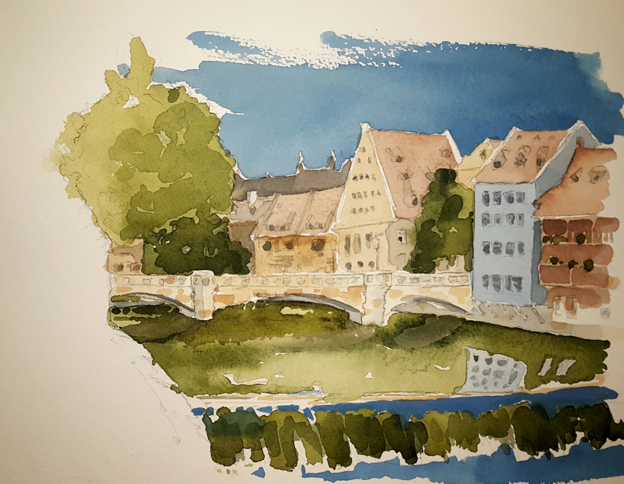 Nuremberg is a beautiful city, so why not grab some pastries and coffee and watch the river go by. This is not my best painting, but I was distracted by apple tarts and capuccinos. Picnic by the RiverShare this: Click to share on X (Opens in new window) X Click to share on Facebook (Opens in new window) Facebook Related Tagged on: Germany Nuremberg
