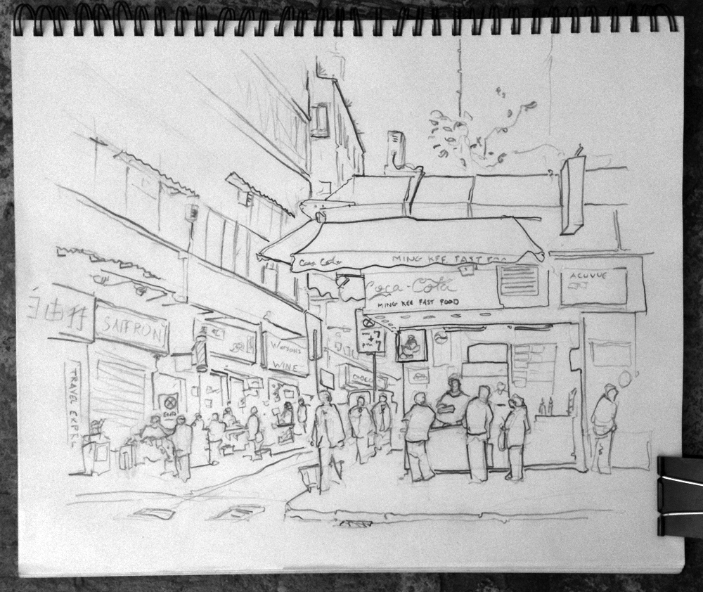 After a lunch of fish curry I went to Tai Koo and did this drawing of Ming Kee’s fast food place and the illegal street hawkers. The police arrived before I finished and the streets immediately cleared. It is amazing to see people running with so much stuff on their backs. But besides that, I spoke to very few people here because everyone is too busy chasing money to see what is going on around them.