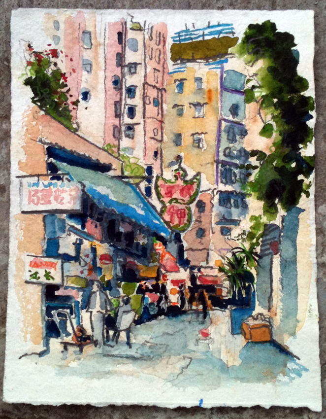I started off this morning in Wan Chai. This painting of a pawn shop was done near the street market. I had a good time painting and enjoyed talking to people, but the painting didn’t really turn out. I need to work harder at sketching with my water colors. It also didn’t help that I forgot my paint tray and had to work with the tubes I had packed away last week. The wind is also strong today as a cold front is coming in. It is going to get down to a frosty 15c tonight (60f). brrrrrrr……